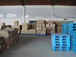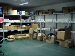倉庫スペース2,000m2は効率よく収納されています。倉庫には「質量在我手中,客戸在我心中」の横断幕で商品を扱うスタッフの意識を高めています。 |